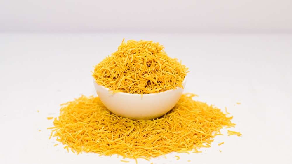 Sev is a popular Indian snack made from gram flour (besan) dough that is spiced, extruded through a special sieve or press, and deep-fried into crispy, thin noodle-like strands. Sev is a versatile ingredient, enjoyed on its own as a crunchy snack or used as a topping in various dishes.